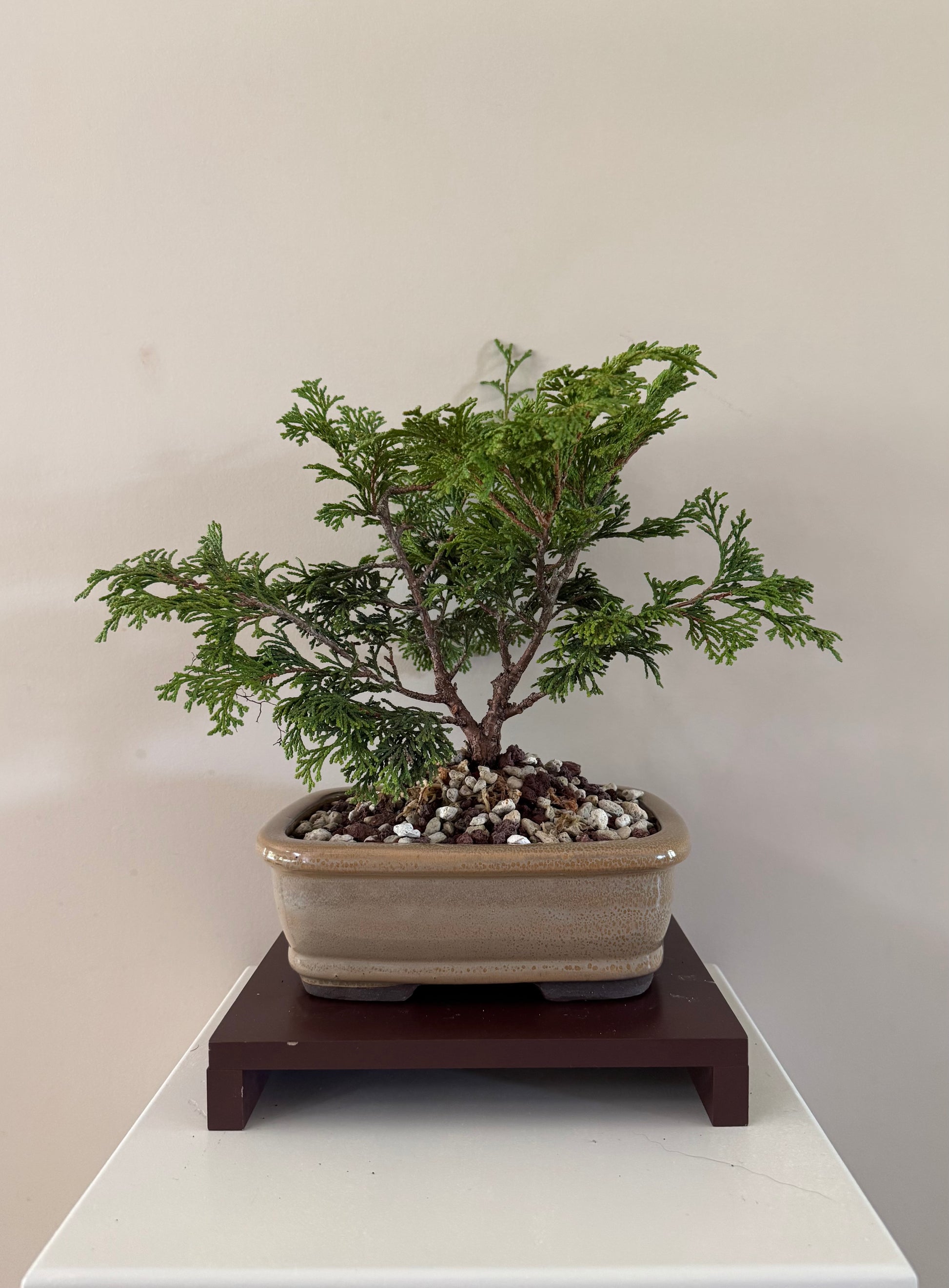 This Chamaecyparis Obtusa 'Pygmaea' bonsai has been nurtured with time and care, its evergreen form resting in a glazed ceramic pot (8 inch) in beige. Each curve tells the story of patient shaping and quiet devotion.