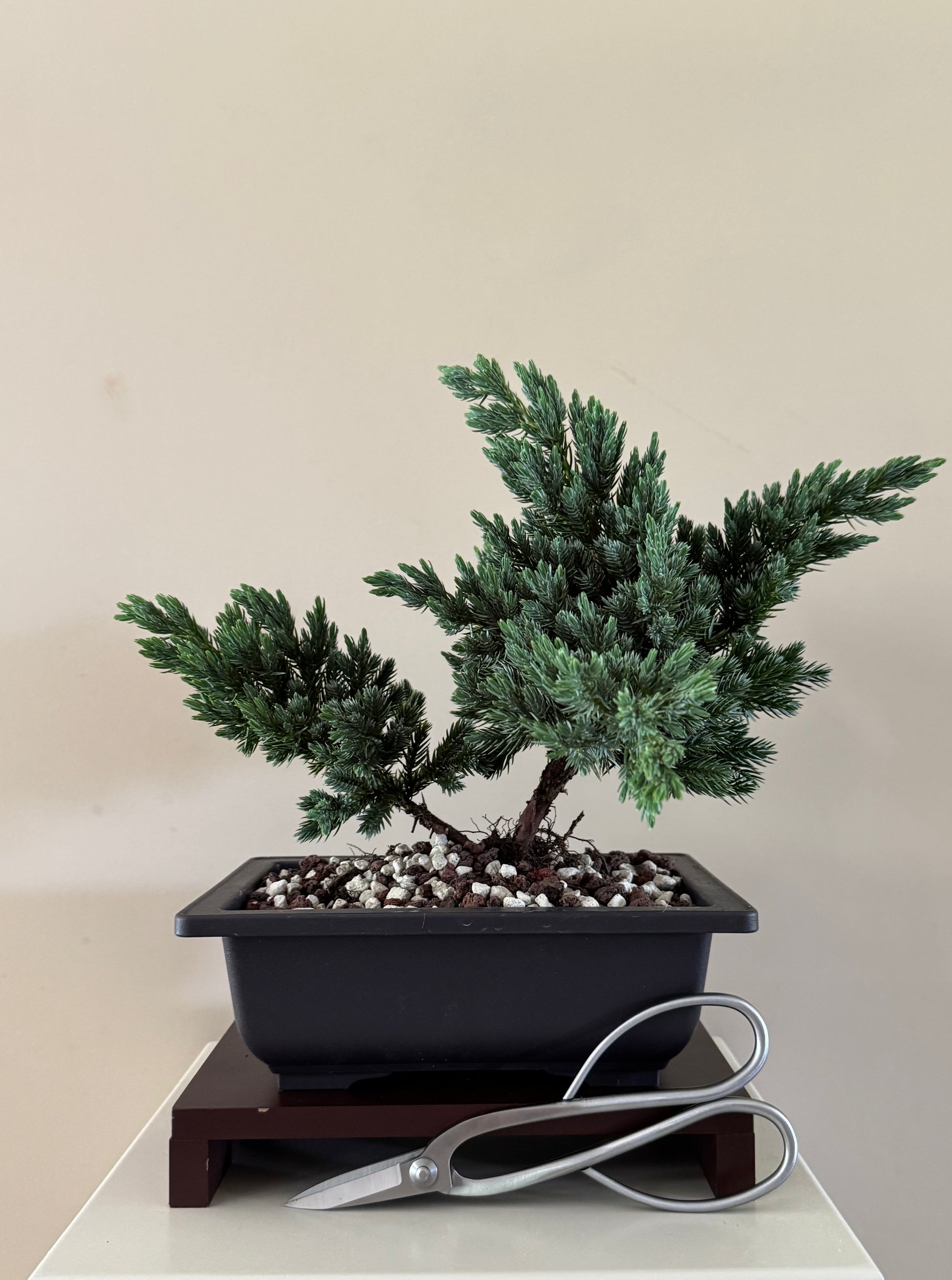 This Juniperus 'Blue Star' bonsai grows with quiet strength, its needles arranged in gentle balance. Nurtured in a black training pot, it carries the spirit of simplicity and discipline at the heart of bonsai art.